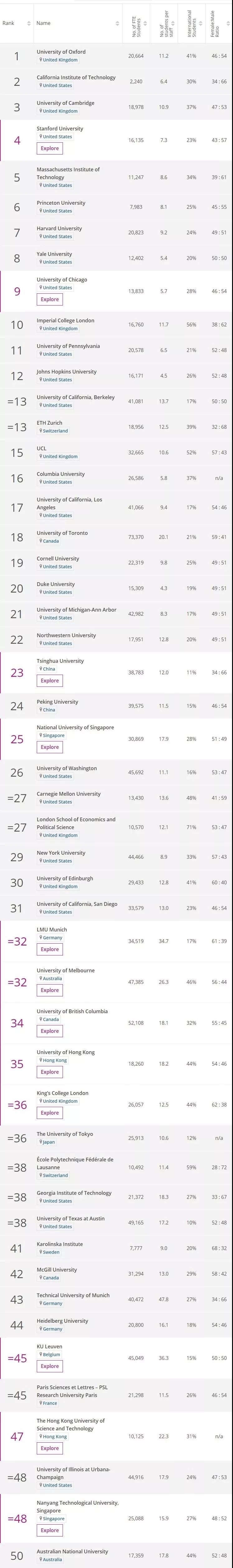 美国则有40所高校入围前一百,其中加州理工学院、斯坦福大学、麻省理工学院、普林斯顿大学、哈佛大学、耶鲁大学、芝加哥大学、宾夕法尼亚大学、约翰霍普金斯大学、加州大学伯克利分校依次为美国地区的前十。清华大学和北京大学分别位列23名和24名,是亚洲大学中排名最好的两所院校。不同的世界大学排名有着不一样的评判标准,泰晤士高等教育世界大学排名则更侧重学术成就与资源,其具体排名依据是: