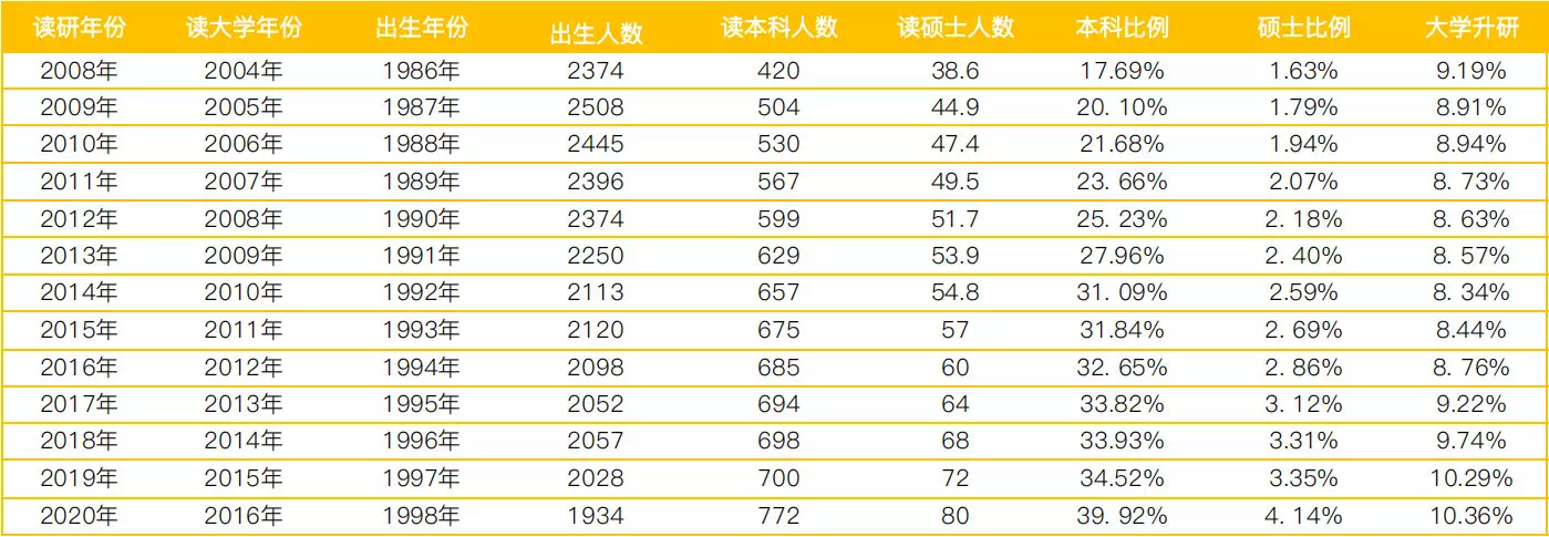 经常会有人说,国内读本科比例不超过5%!是的,但是将1岁-17岁以及50岁以上的都算进去,对我们个人来说是没有什么参考性的。下面小曼带大家看一组数据:假设18岁读大学,22岁读硕士,这张图就大致反映了同龄人中本科及硕士比例,大家可以感受一下这十来年大学生跟研究生比例的变化。