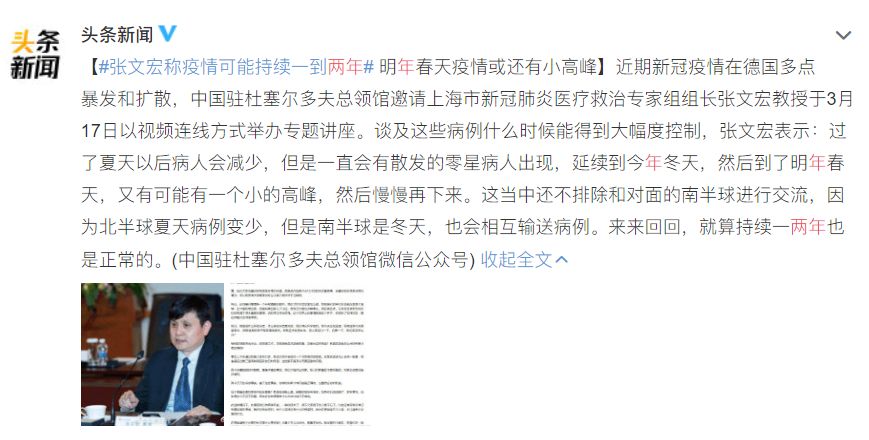 近期,张文宏医生称疫情可能持续一到两年,明年春天疫情或还有小高峰。过了夏天以后病人会减少,但是一直会有散发的零星病人出现,延续到今年冬天,然后到了明年春天,又有可能有一个小的高峰,然后慢慢再下来。这当中还不排除和对面的南半球进行交流,因为北半球夏天病例变少,但是南半球是冬天,也会相互输送病例。来来回回,就算持续一两年也是正常的。