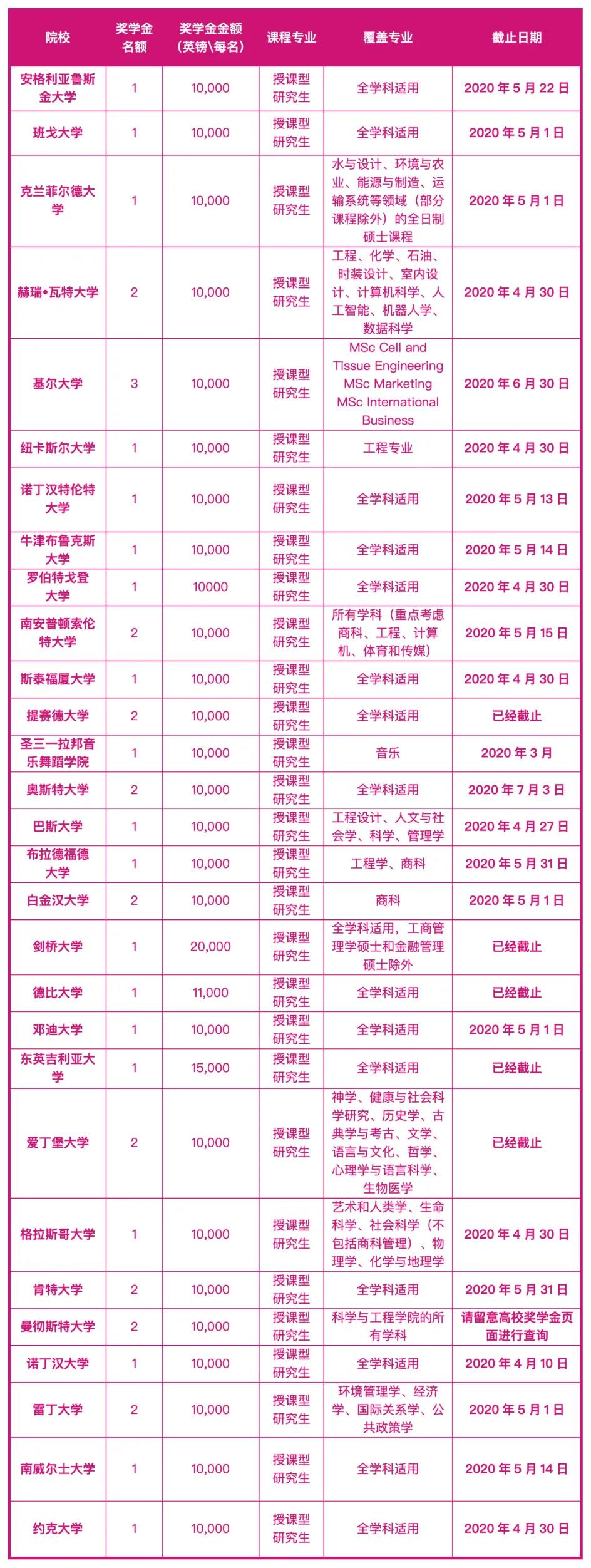 | “2020非凡英国奖学金计划”参与院校名单