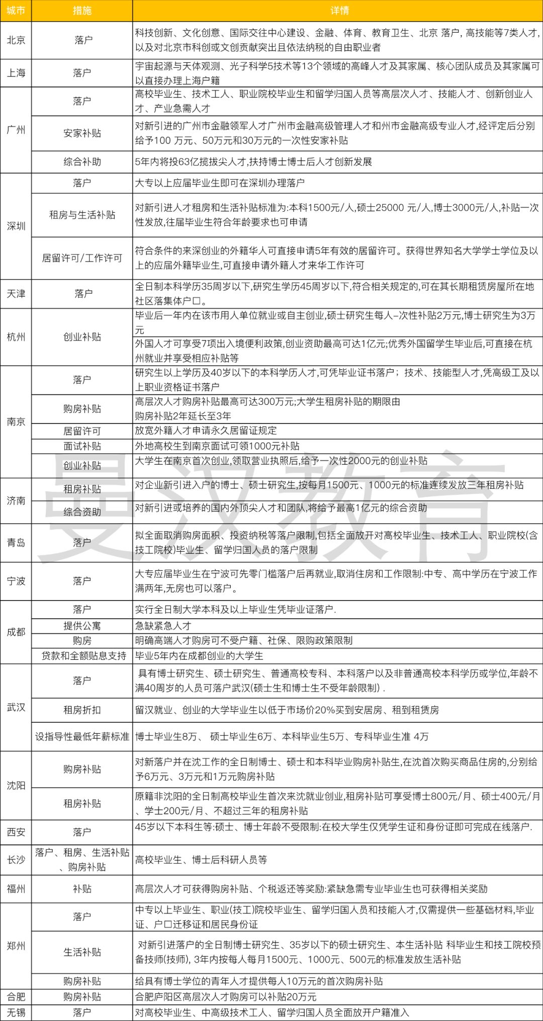 各地“抢人”大战时刻在进行,毋庸置疑,国家对高层次人才的福利是特别丰厚的,各地人才引进政策可参见下表↓