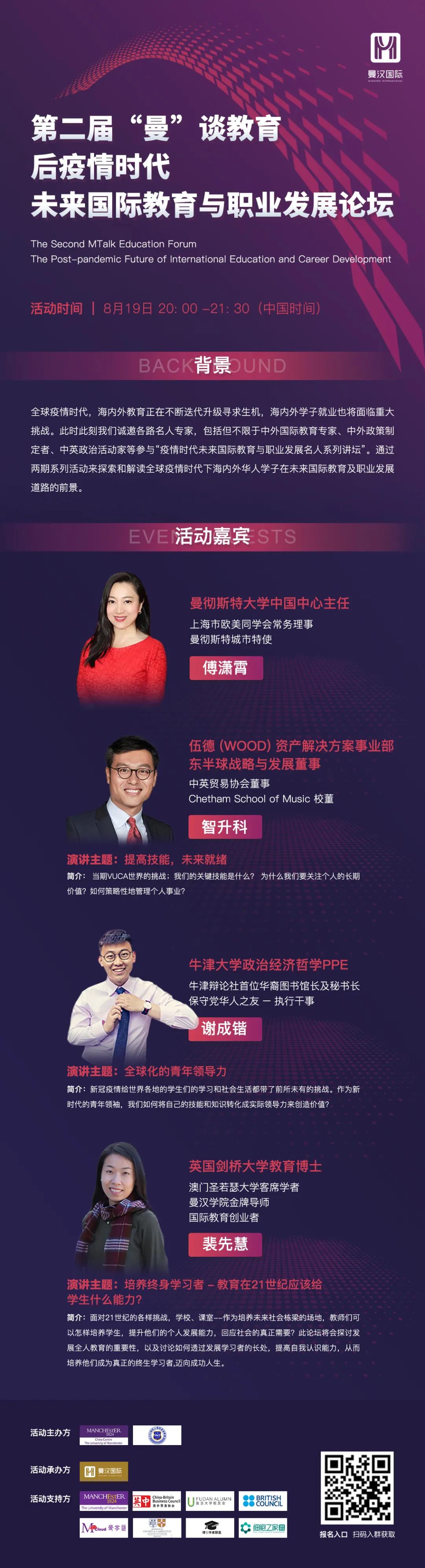 在这一特殊时代背景下,由曼彻斯特大学中国中心、985高校上海校友会联盟联合主办,曼汉集团承办的第二届“曼”谈教育论坛,将以后疫情时代国际教育与职业发展为核心展开,由曼彻斯特大学中国中心傅潇霄主任为致辞代表,英中贸易协会智升科博士,牛津大学政经哲系杰出学生代表谢成锴先生,英国剑桥大学教育学博士、曼汉学院金牌学术导师裴先慧博士为特邀演讲嘉宾,共同探索和解读后疫情时代下,海内外华人学子在未来国际教育及职业发展道路的前景。