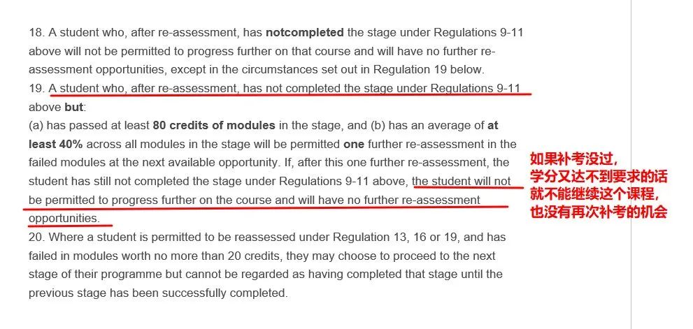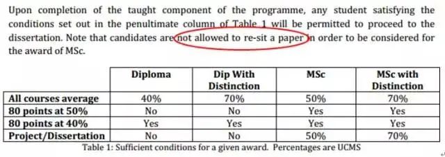 1. 必须均分达到50%(50分),并且满足到达50%(50分)的科目加起来的学分在80分以上,毕业论文的分数也不能低于50%(50分)。 2. 如果论文挂了,就与硕士学位无缘了,因为明文规定“not allowed to re-sit a paper”(不能够“重写”论文)。但也有特殊情况,遇上比如亲友过世这类的重大变故,造成论文失利,也许可以找学院商议,再次提交论文,但仍旧机会渺茫。 一般Diploma指的是结业证书,Degree才是学位证书,Degree with Distinction (优等生)一般均分要在70%(70分以上),并且通常考官也并不会真的铁面无私,在2%(2分)以内,都有通融余地。 比如68%-69.99%(68-69.99分)就可以拿到distinction(优等生),48%-49.99%(48-49.99分)就可以拿到硕士学位,38%-39.99%(38-39.99分)也能算你通过,拿到结业证书。 不过,如果课程的总成绩达到了学校要求,甚至可以不用补考(也就是有些同学提到的软挂)。