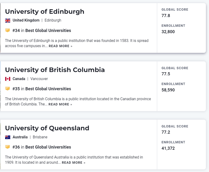 除此之外,加拿大有3所大学入围榜单前一百,分别是:多伦多大学(18)、英属哥伦比亚大学(35)、麦吉尔大学(54);澳大利亚共有8所大学入围榜单前一百,分别是:墨尔本大学(27)、悉尼大学(28)、昆士兰大学(36)、蒙纳士大学(37)、新南威尔士大学(37)、澳洲国立大学(62)、阿德莱德大学(74)、西澳大学(83)。