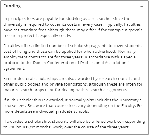 原则上,作为研究人员的学习是要支付费用的,通常,学院会设定标准的费用,尽管这些费用可能会有所不同,例如,一个特定的研究项目特别昂贵。学院提供数量有限的奖学金/补助金来支付学生的生活费用,这些奖学金/补助金可以在广告登出时申请。一般情况下,根据丹麦专业协会联合会协定的一项特别议定书,雇佣合同为期三年。类似的博士奖学金也由研究委员会、其他公共机构和私人基金会颁发,尽管这些奖学金通常用于重大研究项目或处理研究任务。如果授予博士学位,通常还包括该大学的课程费用。请注意,课程费用因教员而异。更多细节见个别研究生院。如果获得奖学金,学生还将获得840小时(6个月的工作时间)的工作,为期3年。