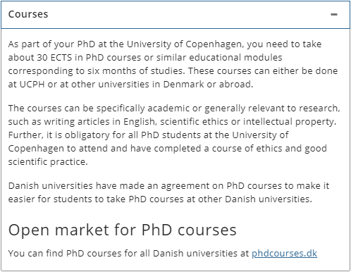 作为哥本哈根大学博士学位的一部分,你需要在博士课程或与六个月学习相对应的类似教育模块中学习30个ECTS。这些课程既可以在UCPH完成,也可以在丹麦或国外的其他大学完成。这些课程可以是学术性的,也可以是与研究相关的,比如用英语写文章、科学道德或知识产权。此外,所有哥本哈根大学的博士生都必须参加并完成一门伦理学和良好的科学实践课程。丹麦各大学已就博士课程达成协议,使学生更容易在丹麦其他大学攻读博士课程。你可以在phdcourses.dk找到所有丹麦大学的博士课程