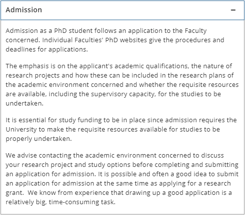 申请攻读博士学位后,须向有关学院提出申请。个别学院的博士网站给出了申请程序和截止日期。重点是申请人的学历、研究项目的性质,以及如何将这些因素纳入有关学术环境的研究计划,以及是否有进行研究所需的资源,包括监管能力。由于入学需要大学提供必要的资源,以便适当地进行研究,因此必须有适当的研究经费。我们建议在完成并提交入学申请之前,联系相关的学术环境来讨论你的研究项目和学习选择。在申请研究资助的同时提交入学申请通常是一个好办法。